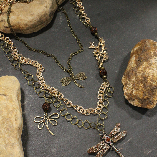 Golden Rod Dragonfly In Flight Layered Necklace