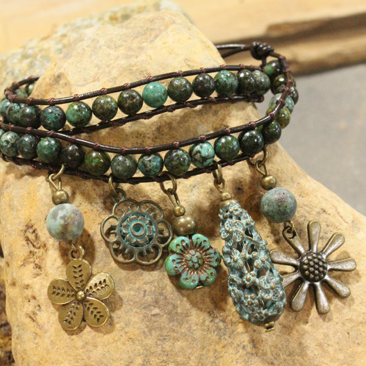 Just Charming Flower Leather & Stone Wrap Bracelet