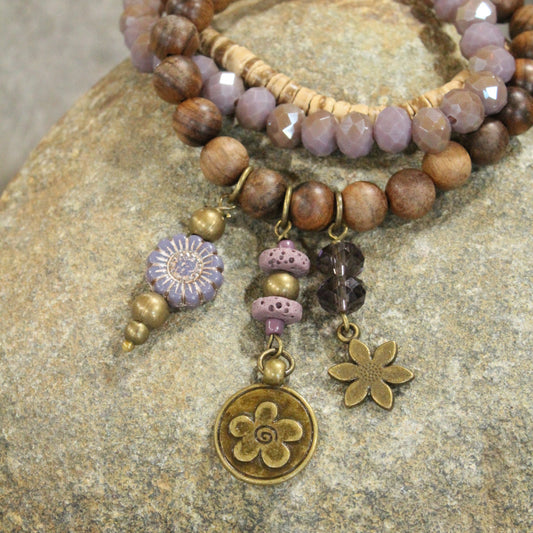 Vintage Stone & Wood Czech Flower Drop Stretch Bracelet Set