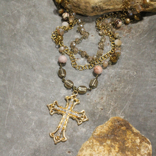 Golden Bling Cross Triple Layered Necklace