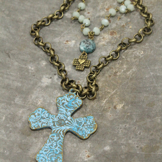 Turquoise & Bronze Cross Pendant Double Layer Necklace