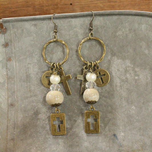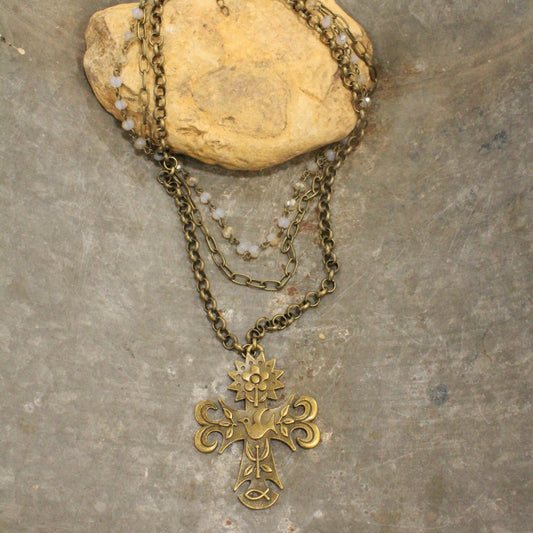 Bronze Cross Pendant Drop Triple Layered Necklace