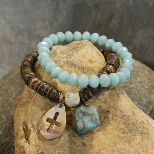 Soft Stone Blue & Cross Pendant Shell Bracelet Set