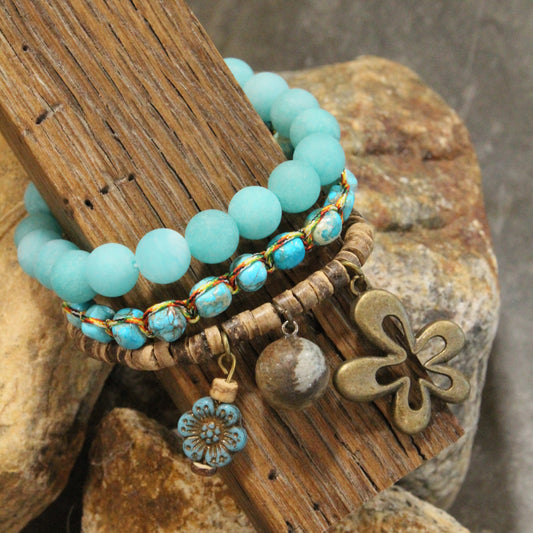 Turquoise Stone & Czech Flower Charm Bracelet Set