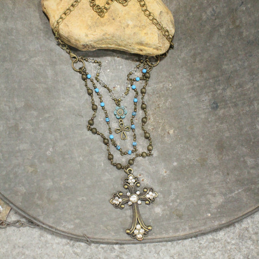 Vintage Bronze Cross Denim Czech Pendant Layered Necklace
