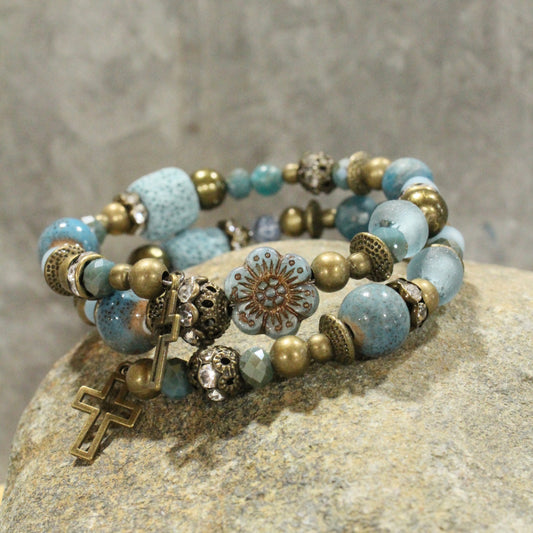 Vintage Bronze Cross & Denim Stone Bead Wrap Bracelet
