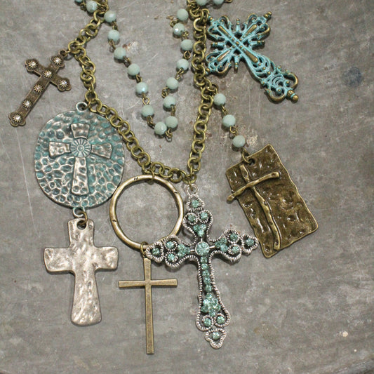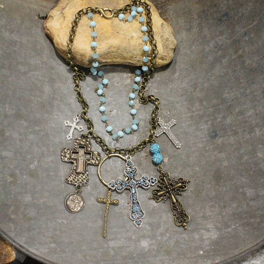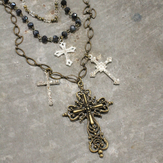 Layered Rosary Chains & Mixed Metal Cross Charmers Necklace