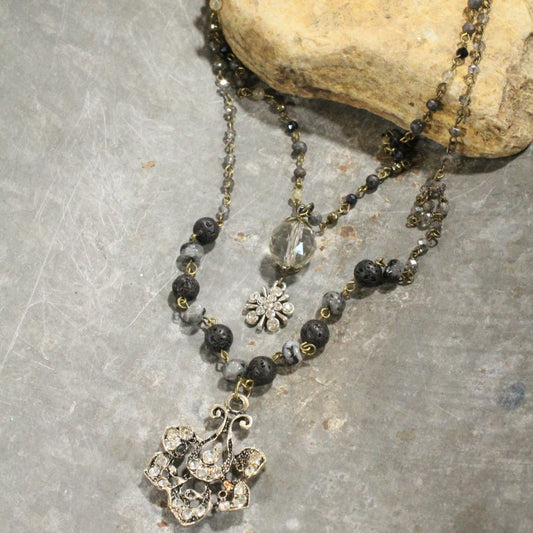 Flower & Stone Drop Layered Bead & Czech Necklace