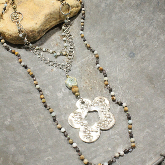 Three Wishes Silver Stone Layered Flower Pendant Necklace