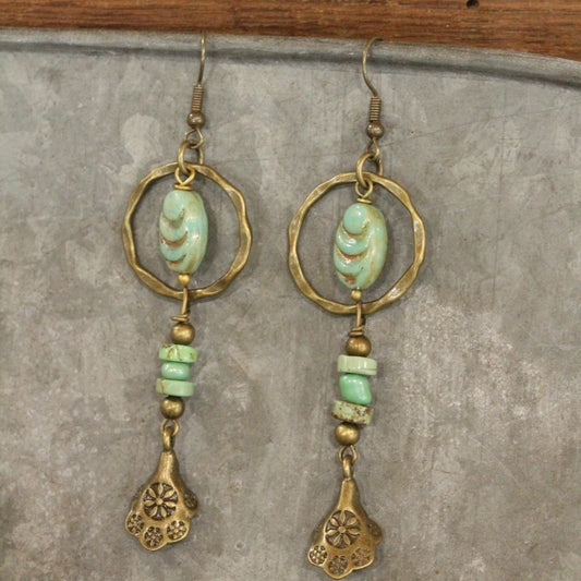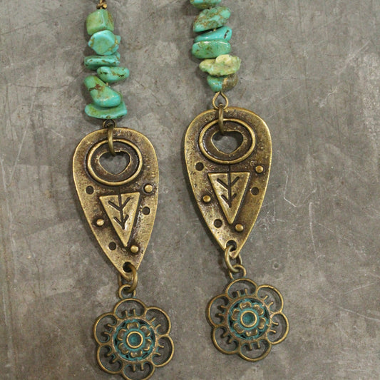 Green Turquoise Chip Beads With Tree & Patina Flower Pendant Drop Earrings