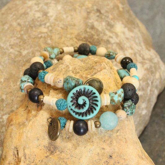 Multi-Colored Natural Stones & Fossil Czech Pendant Wrap Bracelet