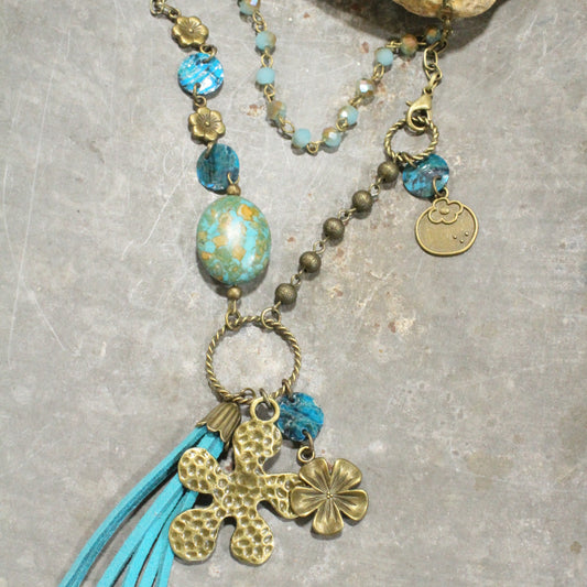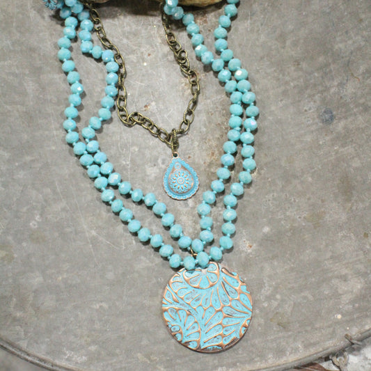 Bronze & Turquoise Flower Pendant Layered Necklace