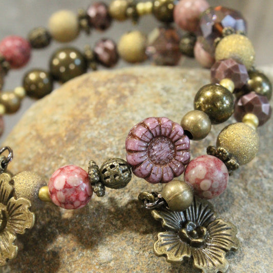Czech Glass Mauve & Bronze Flowers Wrap Bracelet