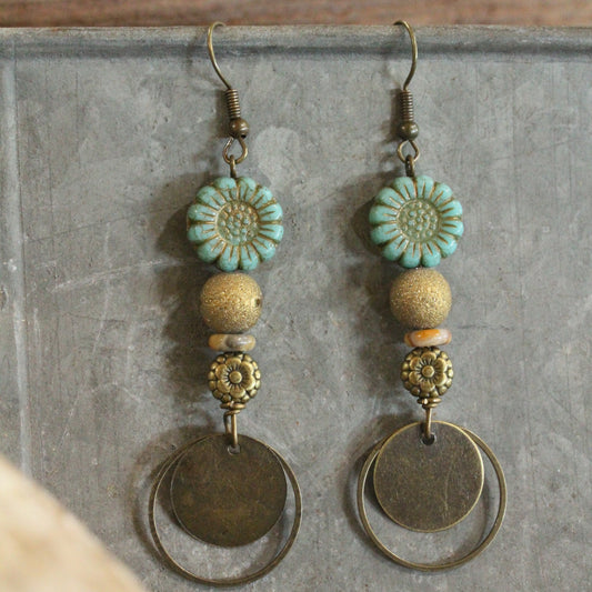 Hammered Wildflower & Czech Layered Pendant Drop Stretch Bracelet Set