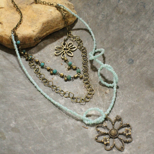 Hammered Wildflower & Glass Layered Pendant Drop Necklace