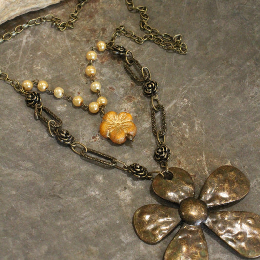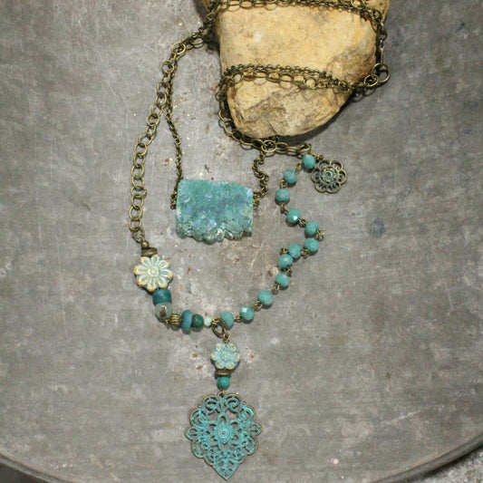 Dying Over Druzy Stone & Czech Flower Layered Necklace
