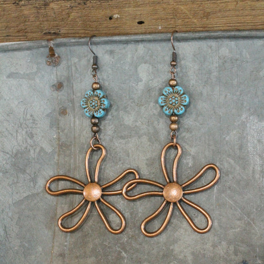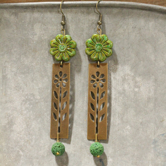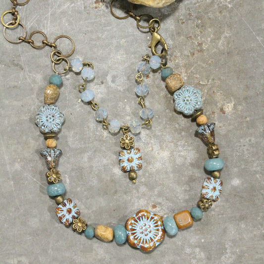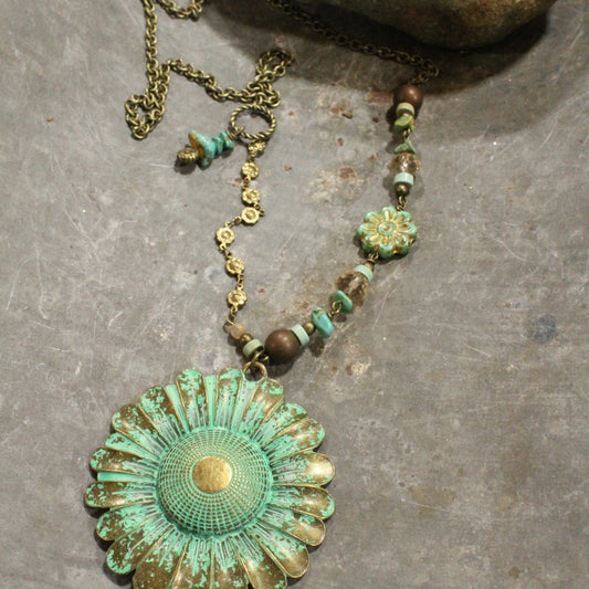 Vintage Verdigris Flower Pendant & Czech Glass Necklace