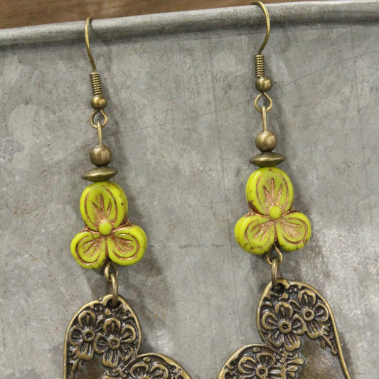 Czech & Bronze Spring Green Charm Dangle Earrings