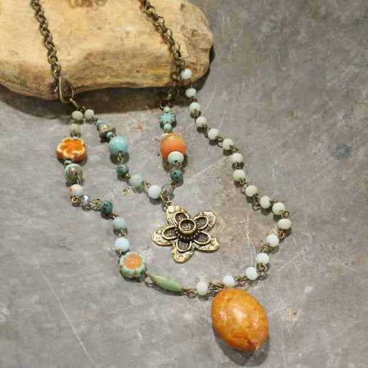 Flower & Stone Drop Layered Bead & Czech Necklace