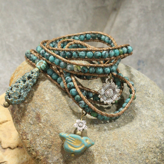 Czech Bird Watching Leather & Stone Flower Wrap Bracelet