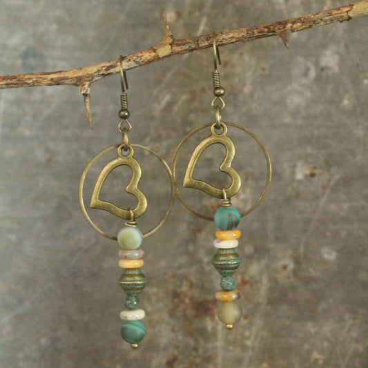 Verdigris Heart Bead Drop Earrings