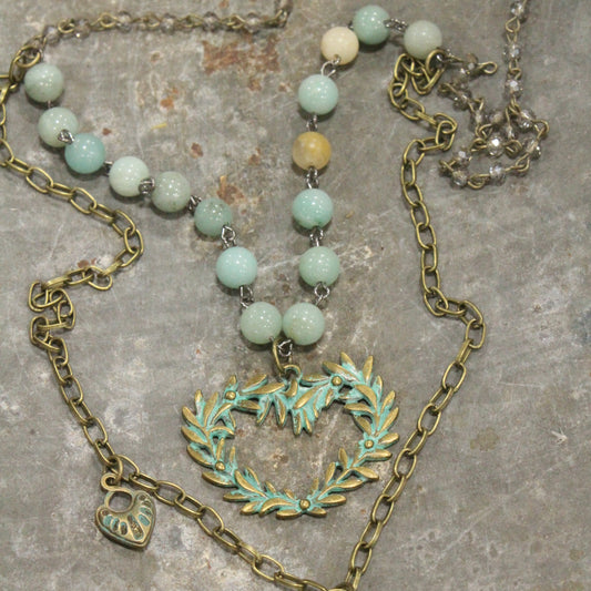 Verdigris Heart Branch Amazonite Double Layer Necklace