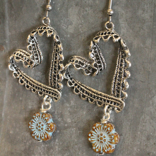 Czech Flower Silver Heart Earrings