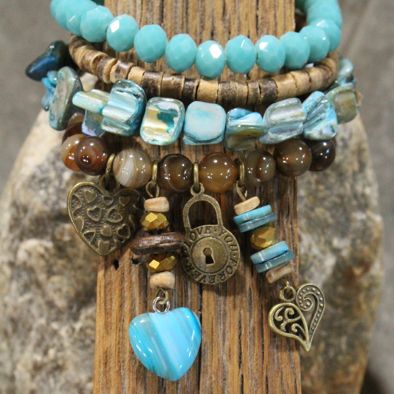 - Set of 4 bracelets; 3 stretch bracelets, & 1 wrap bracelet
