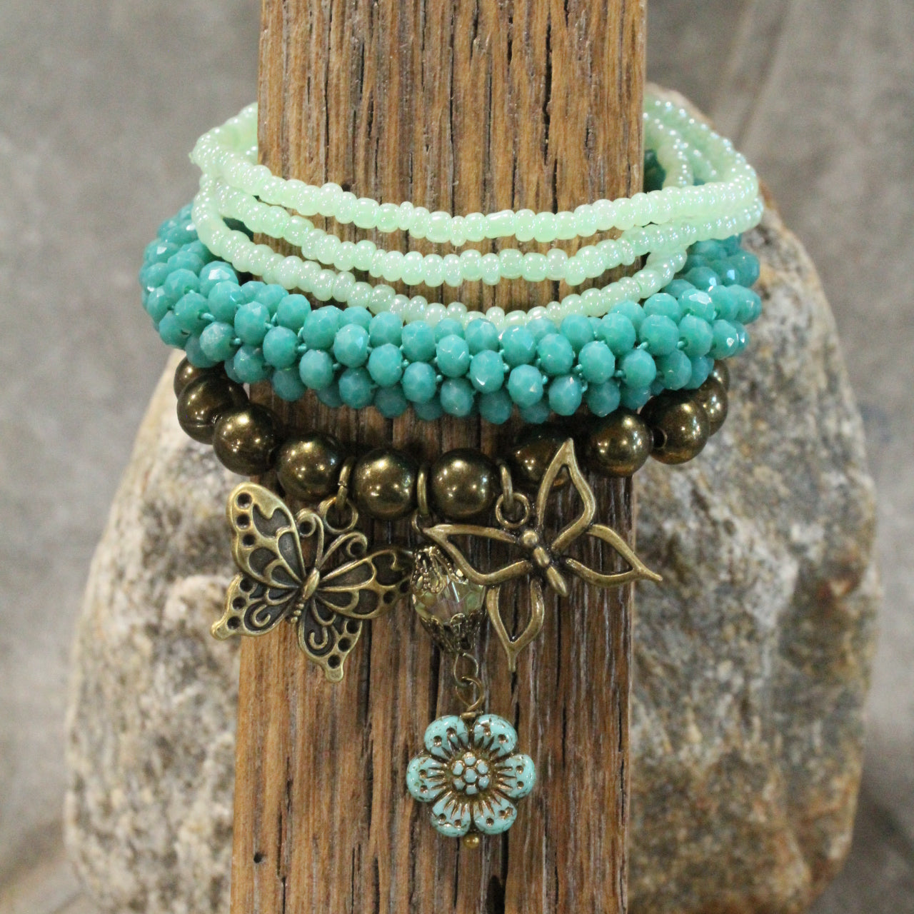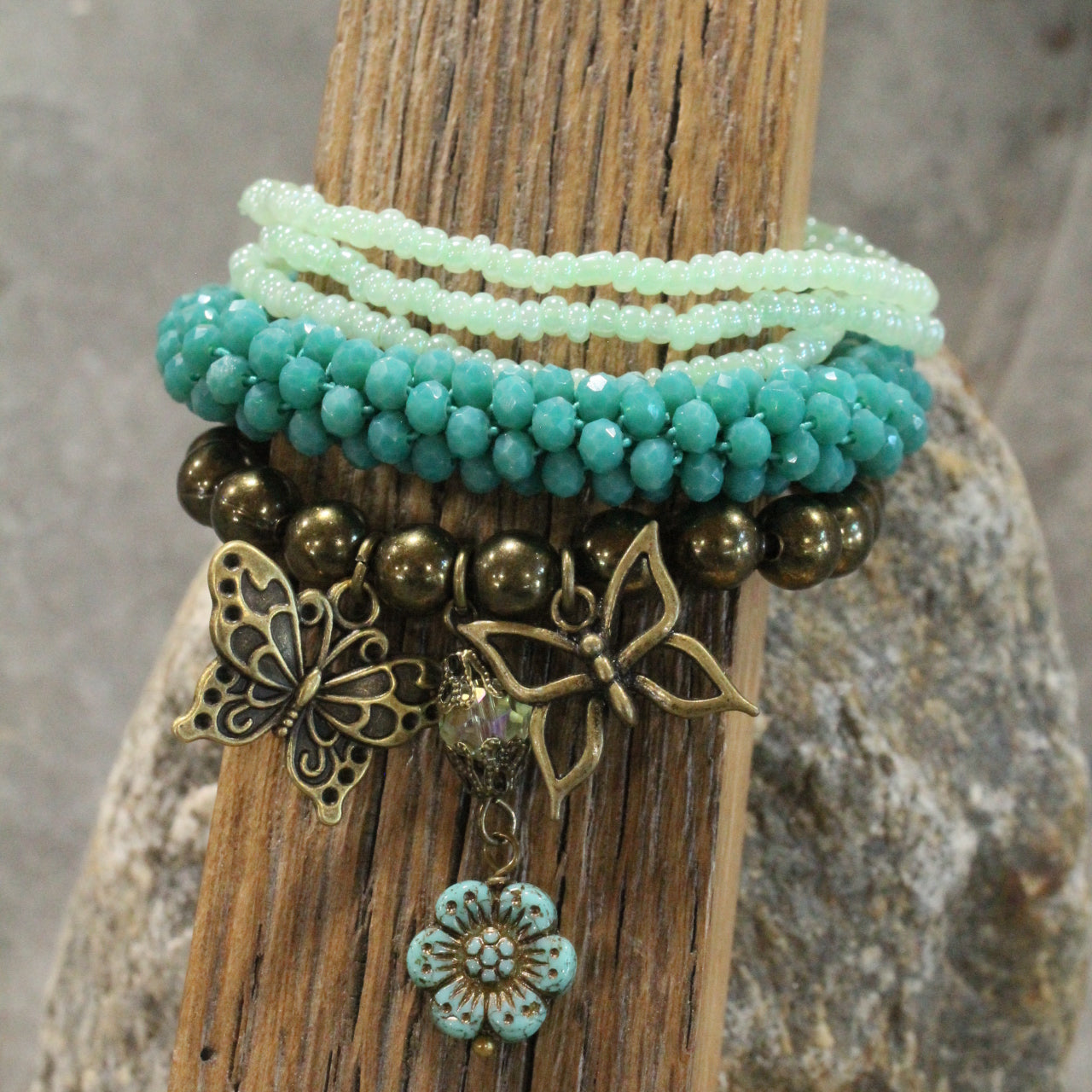 Our ONE-OF-A-KIND jewelry is handcrafted & created just for YOU. We carefully handpick our stones & findings to ensure that each Collection allows you to elevate your wardrobe & express your unique style. Our designs are created with vintage Czech beads, textured Picasso beads, crystals, natural stones; which includes: amazonite, quartz, fossil, jasper, jade, howlite, hematite, lazuli, turquoise, & more. To top off these designs, each piece will be touched with a mixture of nickel, gunmetal, bronze, silver, & copper, metals.